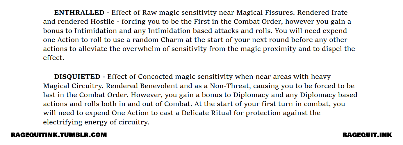 As stated, everyone has access to Magic. In fact, regardless of what Pursuit (our version of Classes) you choose, you’re able to have access to using magic both within the Pursuit specific abilities or through the use of other things like Spells and Charms that can easily be learned and made. It’s just that depending on the kind of pursuit you’re playing, it will rely on one of either kind of magic available: Raw or Concocted.
