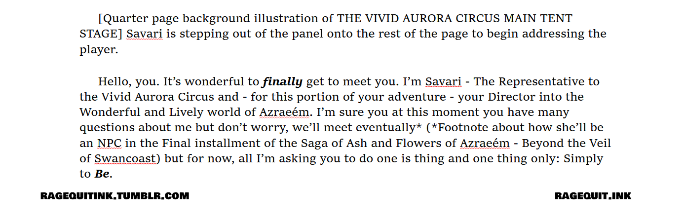 We wanted to do this to give us more permission to be a bit ham with not just our role playing but also with how we’re developing everything outside of role playing. So many TTRPGs these days seem to not put as much emphasis on the Role part of Role Playing, so why not just write it like a play to remind you that this is what’s happening?
